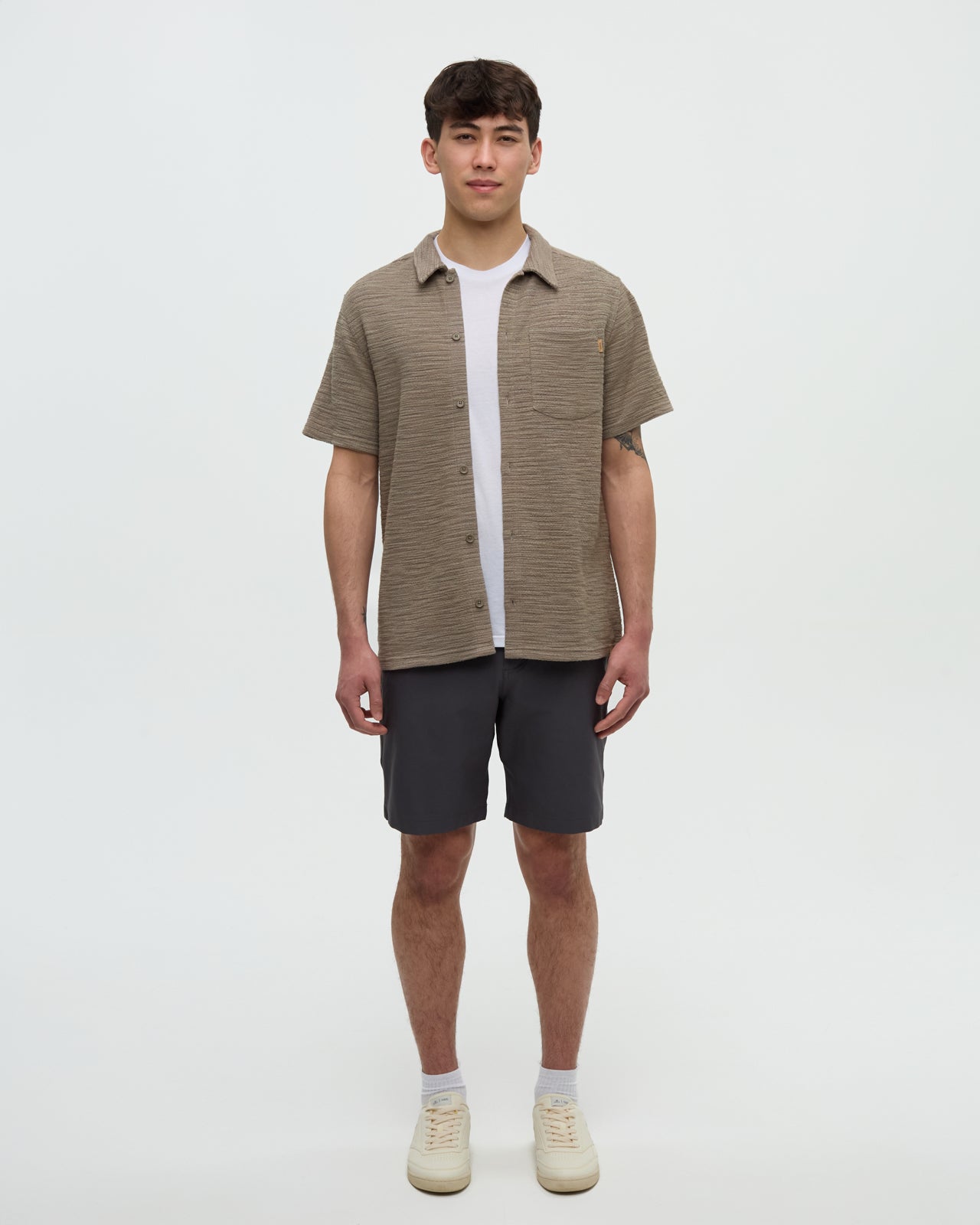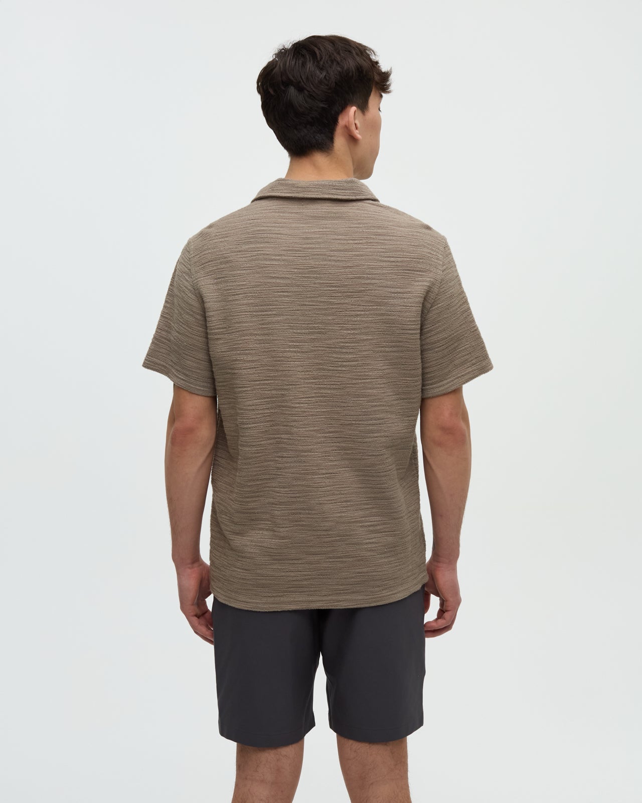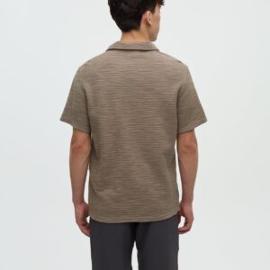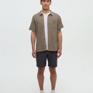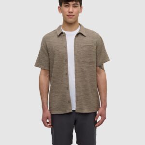 Knit with a distinctive striped effect, this button-up shirt is cut from a blend of cotton and polyester fabric to keep things breathable. We couldn’t find a great transitional tee, so we made this. You’re welcome.