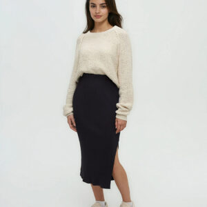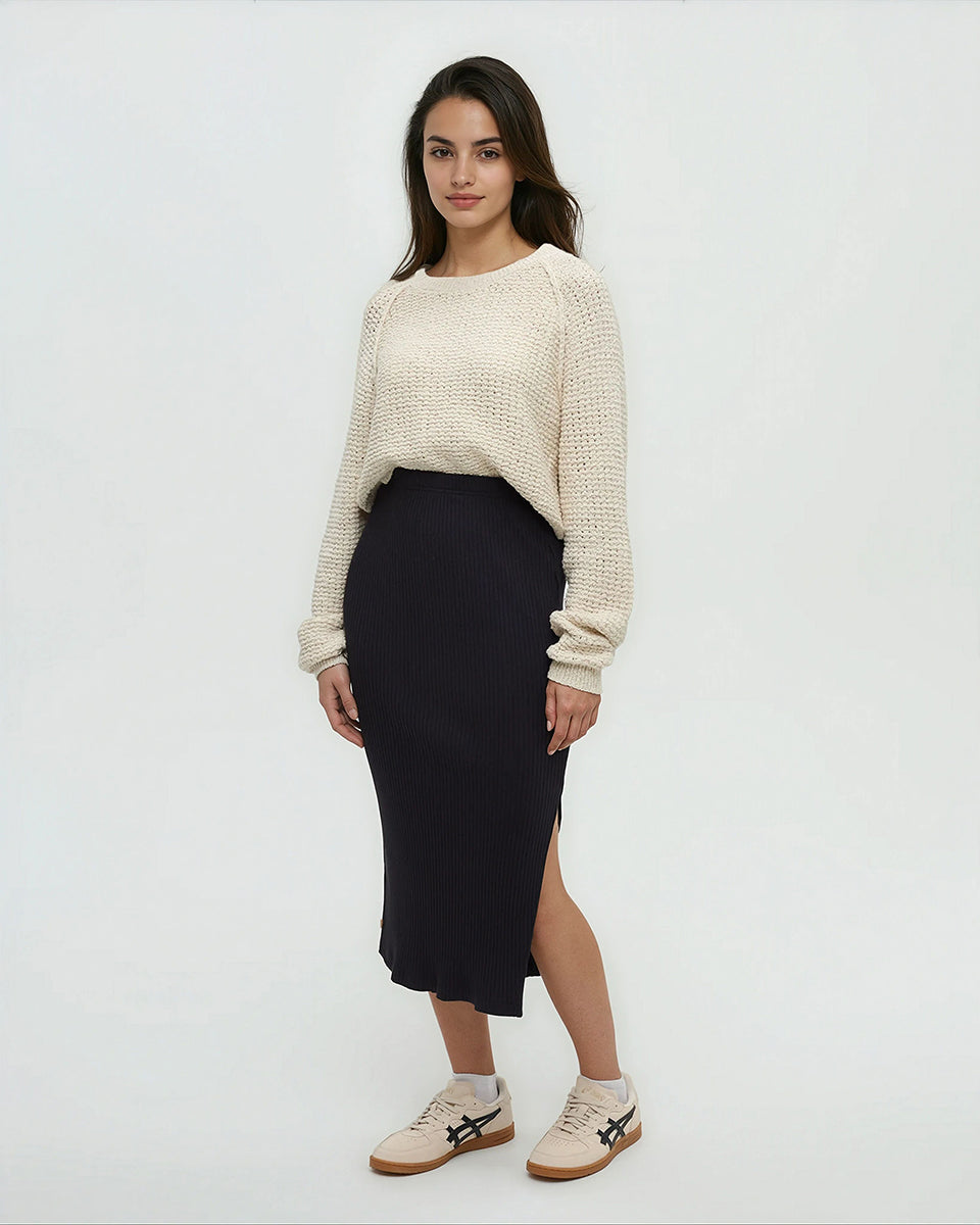 This skirt is really wonderful. It has a beautiful stylish cut so looks like a pencil skirt, but since it is made of cotton and tencel it is dreamy soft like lounge clothes. This is a skirt has easy attractiveness that you can easily dress down and wear totally casually, or dress up, just add a nice belt and it can be office-wear. Super flattering and stylish cut, while feeling as easy as lounging at home.