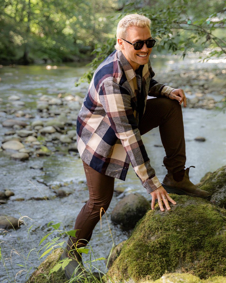 Answer the call of the outdoors in this heavyweight, retro-inspired plaid made from a sustainable blend of organic and recycled cotton that softens with every wear.
